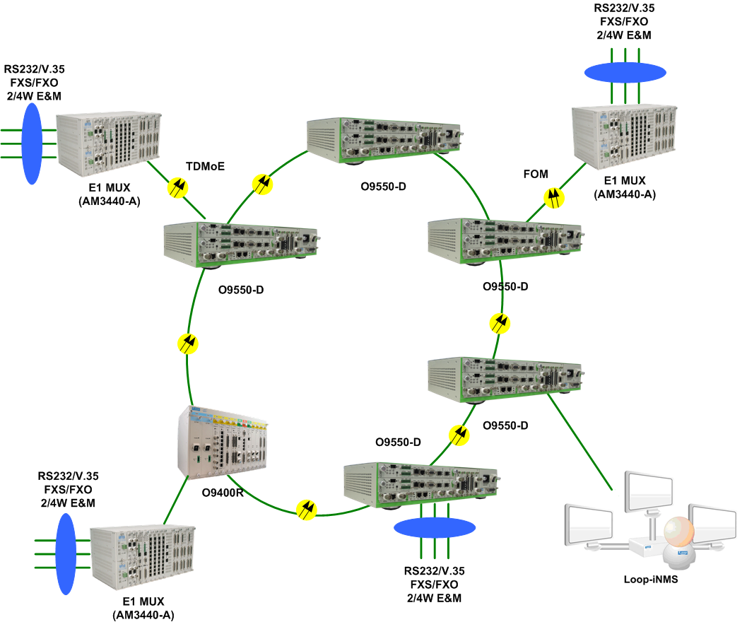 The Loop-O9550-D SDH/SONET IMAP (Integrated Multi-Service Access Platform) is an economical STM-1/4 (OC-3/12) access multiplexer. It is designed to combine digital access interfaces, including TDM, IP, and voice interfaces into STM-1/4 (OC-3/12) optical lines for convenient transport and switching.
