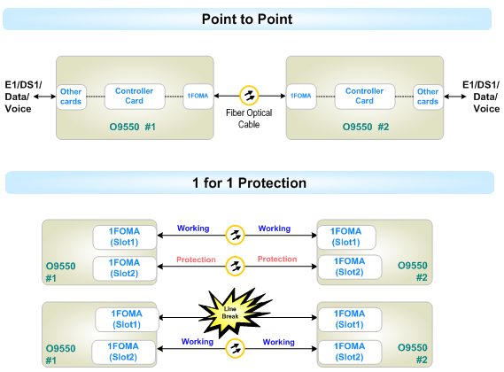 The fiber optical interface is designed for Loop-O9550 as embedded 1 or 4 E1 fiber optical modem. This plugged-in card can be used to aggregate 1 or 4 E1 channels to a single fiber optical interface to connect with other Loop-O9550.