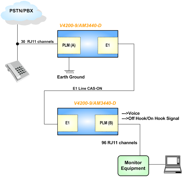 The Phone Line Monitor comes in two types, (A) line plug-in card for one site and (B) monitor plug-in card for another site for Loop-V4200 9-port / AM3440-D device. The card is applicable for a telephone monitoring system. Voice coding can be selected as either A-law or mu-law. This unit can be used on systems running with 110 to 220 Vac or -48 Vdc power supply.
