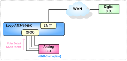 The QFXO plug-in cards are a series of 2 different plug-in cards designed for the Loop-AM3440-B and Loop-AM3440-C. It allows voice frequency interfaces to be multiplexed as a 64 kbps DS0 signal onto a digital network. The QFXO provides four voice connections to central office or PBX and provides user selectable A-law or mu-law coding. Most popular signaling conventions are supported, including PLAR (private line automatic ring down).