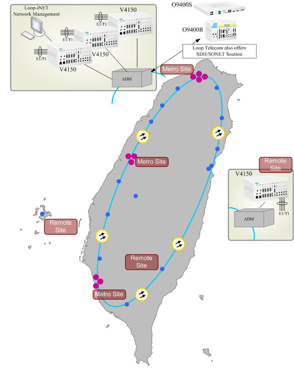Loop Telecom deployed the Loop-V4150 DS0 Cross Connect System at central and remote sites along the island. The high scalable DS0 grooming solution is used to maximize the fill rate on their E1 facilities, plus easily remotely manage their network via user friendly GUI Loop-iNET Intelligent Network Management System. With flexible solution, space saving, and friendly GUI network management provided, the 6 U height of Loop-V4150 DS0 Cross Connect System helps customers with dramatic savings in capital and operating cost.