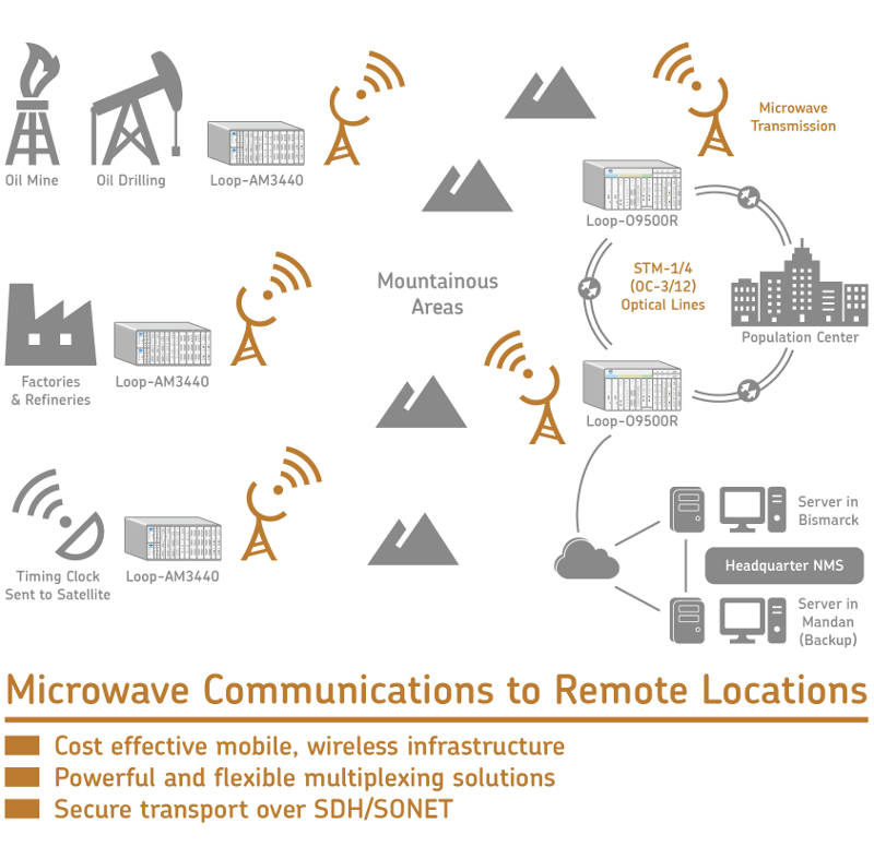 Because of Loop Telecom’s products, the business customer was able to communicate between remote sites and with the company headquarters. Loop's product worked seamlessly with the microwave radio towers to allow long range communication across rural areas and last-mile low speed access with traditional interfaces.