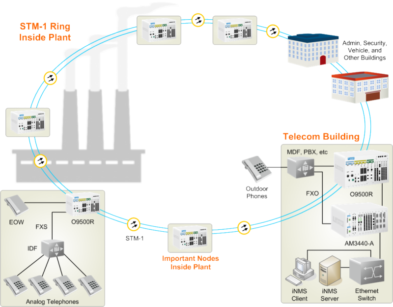 The main part of the installation consisted of an STM-1 ring with the Loop-O9500R at important nodes inside and outside the plant. At these nodes, FXS interface ports connected to analog telephones at important sites, and each station also provided an EOW (Ethernet Order Wire) for station to station communications.