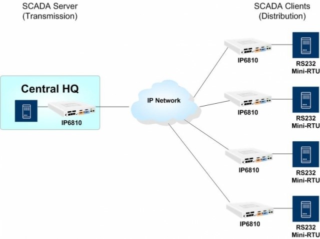 The IP6810 provided this conversion box as well as the necessary software to uniquely identify its location on the network. In short, the IP6810 took care of the networking side while the mini-RTU took care of the SCADA control signals. Currently, the IP6810 is used in a point-to-point or point-to-multipoint application using its embedded Terminal Server function. In the future, the IP6810 can be configured as an self healing device in a ring topology to ensure network integrity.
