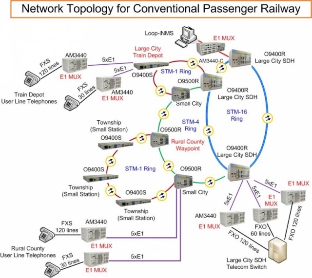 This application is for the communication infrastructure of the conventional railway system in an East Asian country. The purpose of the communication network is to transport voice communication across the network and to report alarms between stations. The drawing is a sample of the entire infrastructure focusing on a particular region within the country.