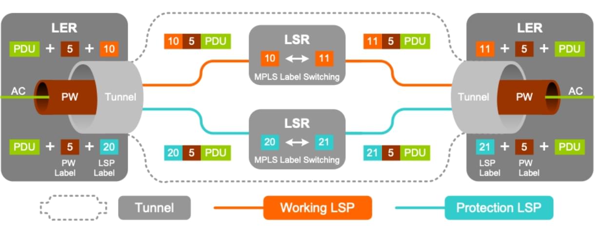 Based on transmission between 2 LER (Label Edge Router) crossing several LSR (Label Switch Router), the LSP (Label Switching Path) is created by adding/changing a label for fast switching over the path. This bidirectional LSP can carry several PW(TDM) and VPWS/VPLS between two LERs.